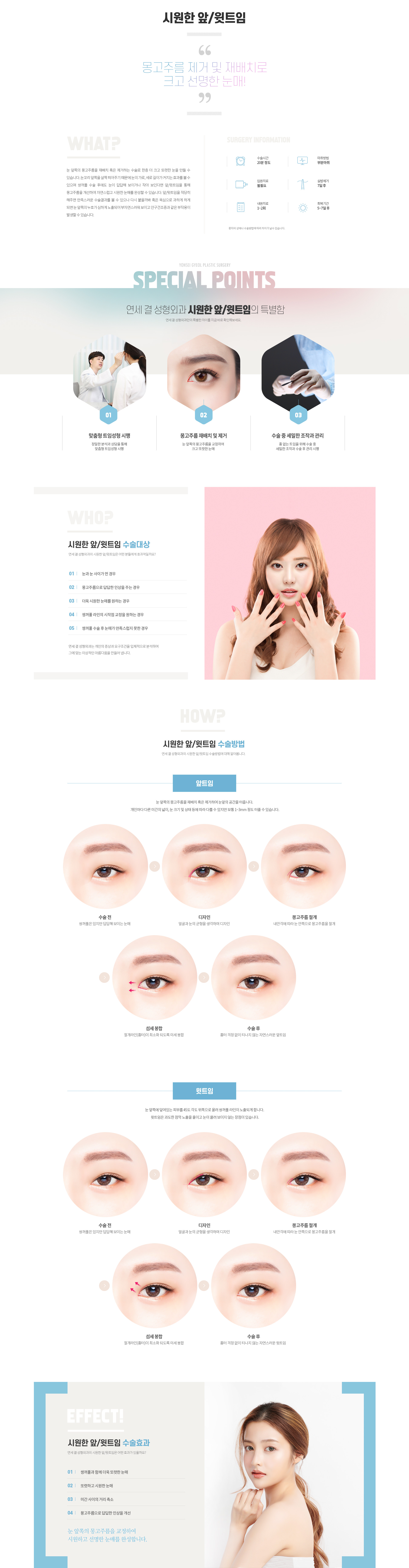 눈 앞쪽의 몽고주름을 재배치 혹은 제거하는 수술로 한층 더 크고 또렷한 눈을 만들 수 있습니다. 눈꼬리 앞쪽을 살짝 틔어주기 때문에 눈의 가로, 세로 길이가 커지는 효과를 볼 수 있으며 쌍꺼풀 수술 후에도 눈이 답답해 보이거나 작아 보인다면 앞/윗트임을 통해 몽고주름을 개선하여 자연스럽고 시원한 눈매를 완성할 수 있습니다. 앞/윗트임을 적당히 해주면 만족스러운 수술결과를 볼 수 있으나 다시 붙을까봐 혹은 욕심으로 과하게 하게 되면 눈 앞쪽의 누호가 심하게 노출되어 부자연스러워 보이고 안구건조증과 같은 부작용이 발생할 수 있습니다.